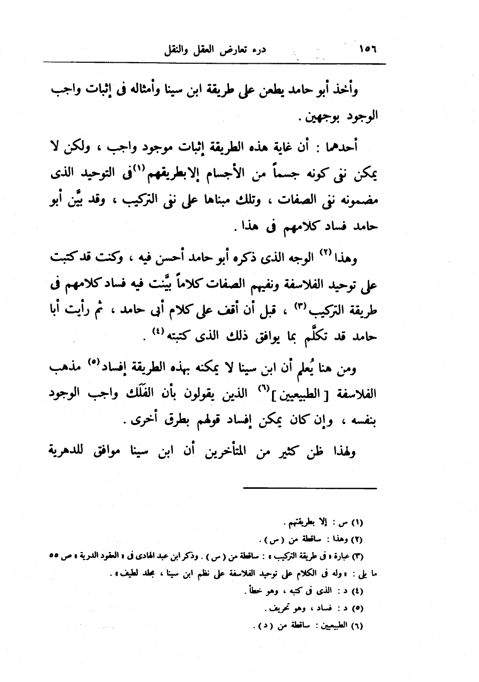 وأخذ أبو حامد يطعن على طريقة ابن سينا وأمثاله في إثبات واجب الوجود بوجهين.
