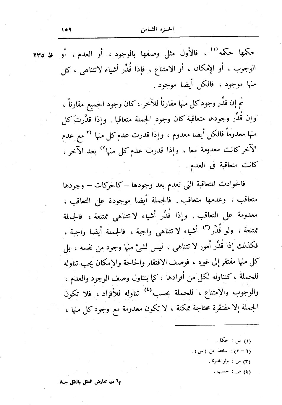 وإذا قدر أشياء لا تتناهي ممتنعة، فالجملة ممتنعة، ولو قدر أشياء لا تتناهي واجبة، فالجملة أيضاً واجبة، فكذلك إذا قدر أمور لا تتناهي، ليس لشيء منها وجود من نفسه، بل كل منها مفتقر إلى غيره، فوصف الافتقار والحاجة والإمكان يجب تناوله للجملة، كتناوله لكل من أفرادها، كما يتناول وصف الوجود والعدم، والوجوب والامتناع، للجملة بحسب تناوله للأفراد، فلا تكون الجملة إلا مفتقرة محتاجة ممكنة، لا تكون معدومة مع وجود كل منها،