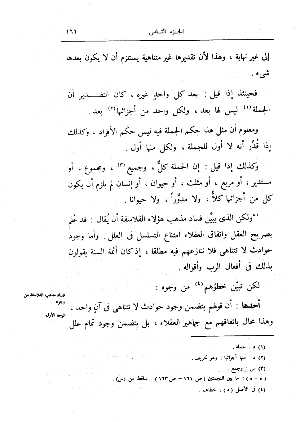 ولكن الذي يبين فساد مذهب هؤلاء الفلاسفة أن يقال: قد علم بصريح العقل واتفاق العقلاء امتناع التسلسل في العلل، وأما وجود حوادث لا تتناهى فلا ننازعهم فيه مطلقاً، إذ كان أئمة السنة يقولون بذلك في أفعال الرب وأقواله.