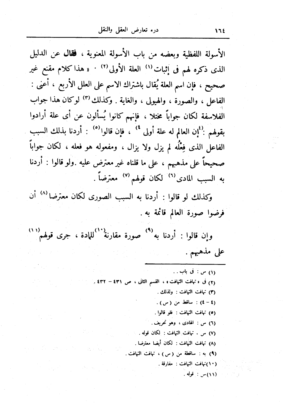 وكذلك لو كان هذا جواب الفلاسفة لكان جواباً مختلاً، فإنهم كانوا يسألون عن أي علة أرادوا بقولهم: إن العالم له علة أولى، فإن قالوا: أردنا بذلك السبب الفاعل الذي فعله لم يزل ولا يزال، مفعوله هو فعله، لكان جواباً صحيحاً على مذهبهم، على ما قلنا غير معترض عليه.