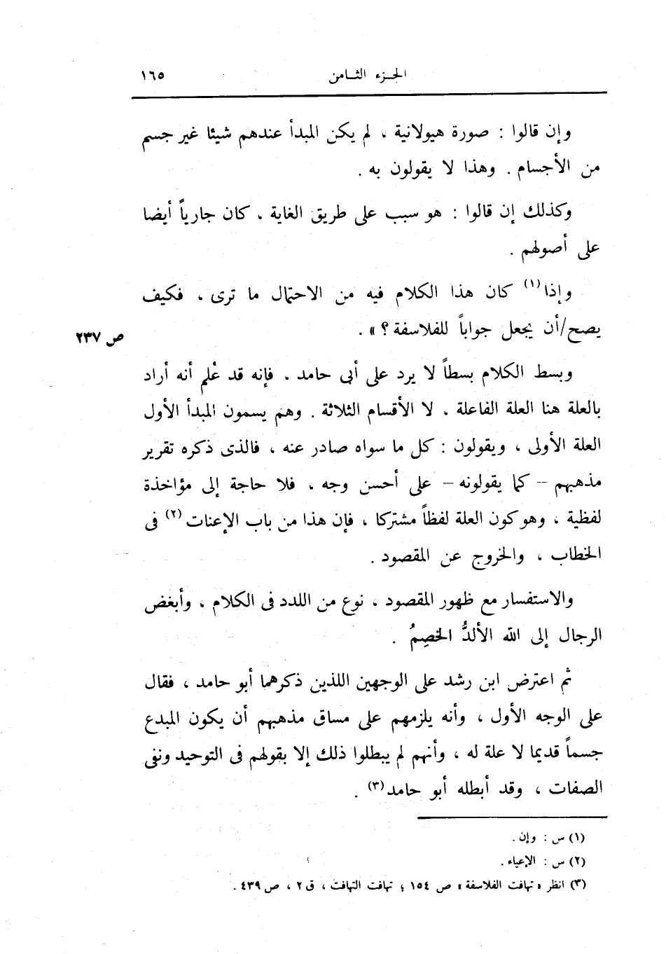 ثم اعترض ابن رشد على الوجهين اللذين ذكرهما أبو حامد، فقال على الوجه الأول، وأنه يلزمهم على مساق مذهبهم أن يكون المبدع جسماً قديماً لا علة له، وأنهم لم يبطلوا ذلك إلا بقولهم في التوحيد ونفي الصفات، وقد أبطلة أبو حامد.