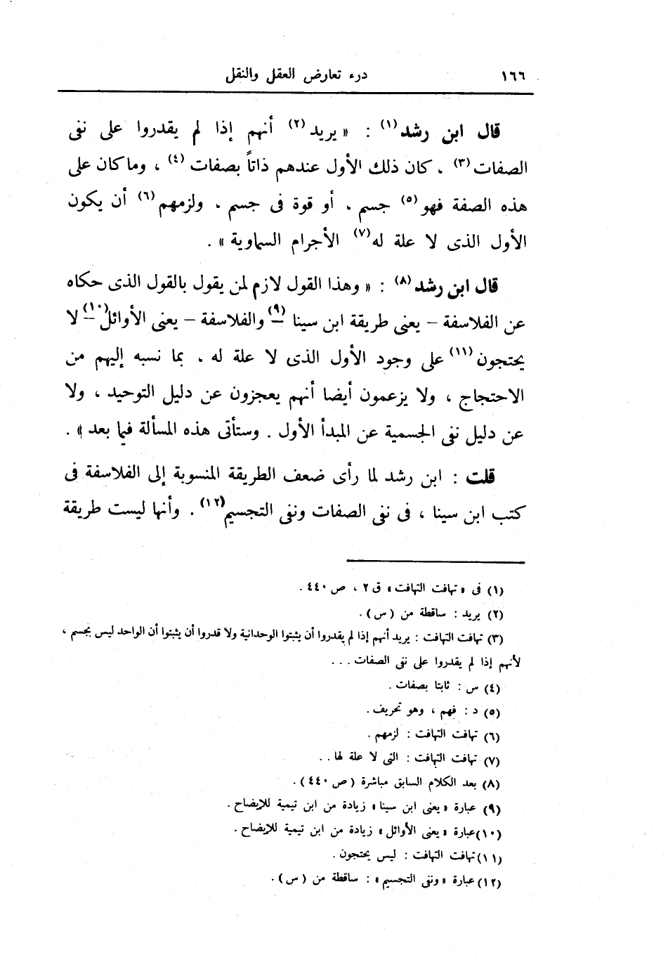 قلت: ابن رشد لما رأى ضعف الطريقة المنسوبة إلى الفلاسفة في كتب ابن سينا، في نفي الصفات ونفي التجسيم.