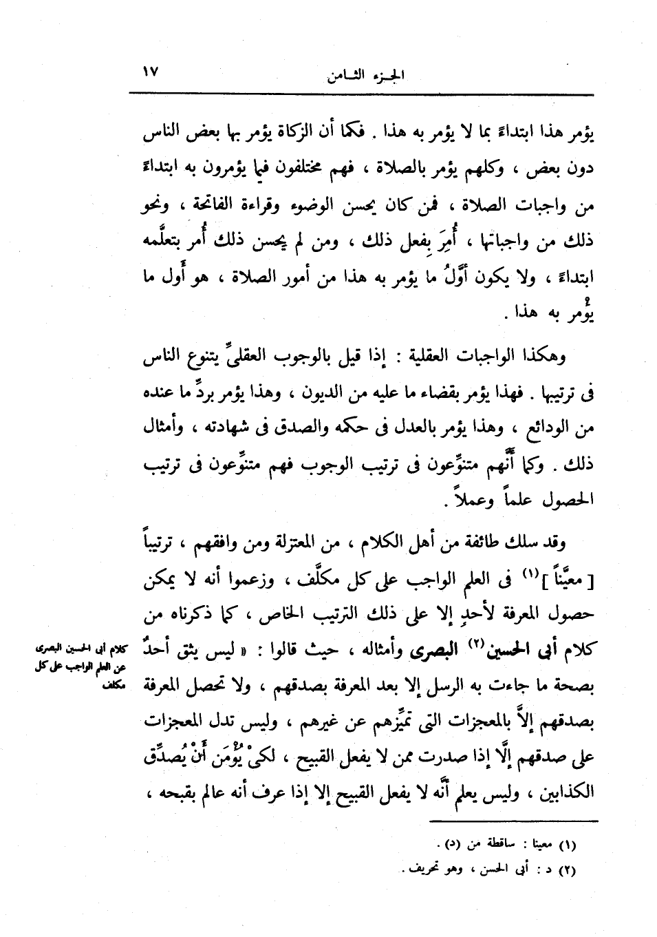 وقد سلك طائفة من أهل الكلام، من المعتزلة ومن وافقهم، ترتيباً معيناً في العلم الواجب على كل مكلف، وزعموا أنه لايمكن حصول المعرفة لأحد إلا على ذلك الترتيب الخاص، كما ذكرناه من كلام أبي الحسين البصري وأمثاله، حيث قالوا: (ليس يثق أحد بصحة ما جاءت به الرسل إلا بعد المعرفة بصدقهم، ولا تحصل المعرفة بصدقهم إلا بالمعجزات التي تميزهم عن غيرهم، وليس تدل المعجزات على صدقهم إلا إذا صدرت ممن لا يفعل القبيح، لكي يؤمن أن يصدق الكذابين، وليس يعلم أنه لا يفعل القبيح إلا إذا عرف أنه عالم بقبحه،