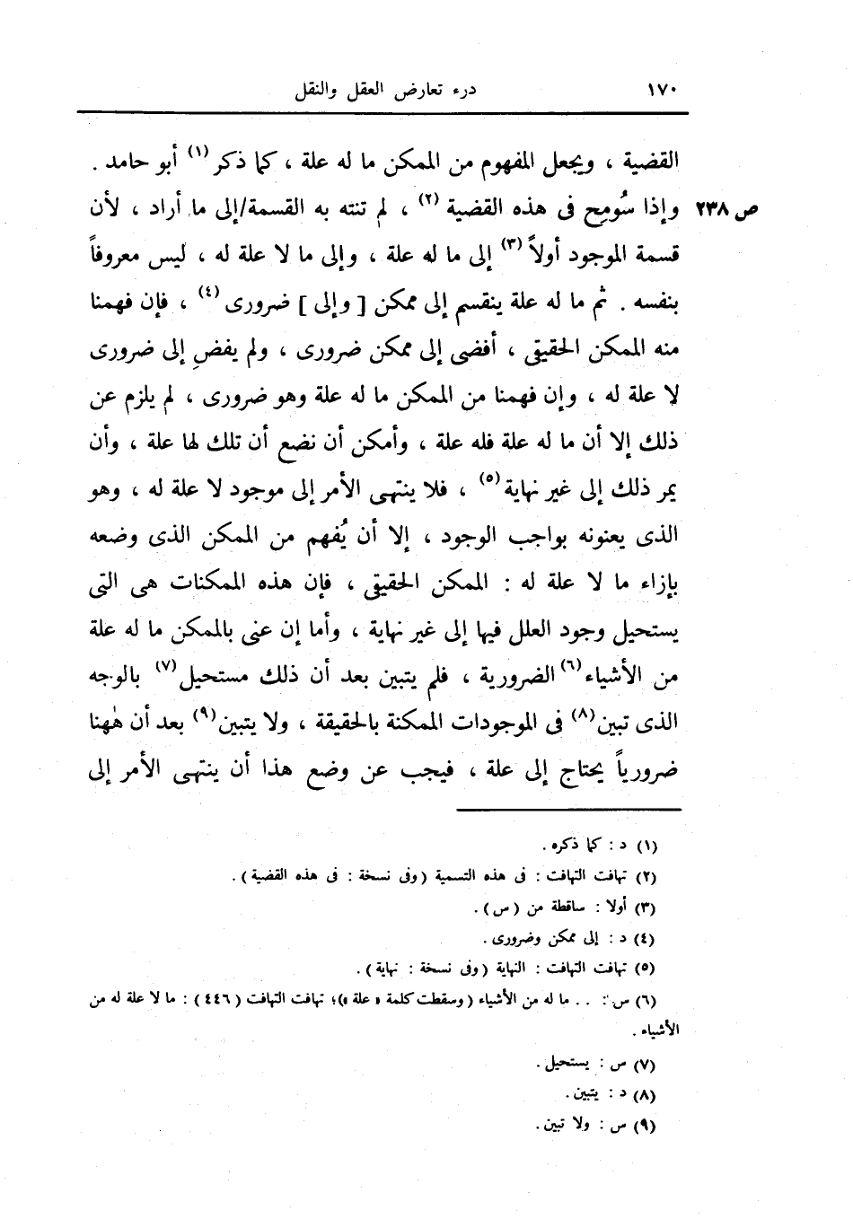 ثم ما له علة ينقسم إلى ممكن وإلى ضروري، فإن فهمنا منه الممكن الحقيقي، أفضى إلى ممكن ضروري، ولم يفض إلى ضروري لا علة له، وإن فهمنا من الممكن ما له علة وهو ضروري، لم يلزم عن ذلك إلا أن ما له علة فله علة، وأمكن أن نضع أن تلك لها علة، وأن يمر ذلك إلى غير نهاية، فلا ينتهي الأمر إلى موجود لا عله له، وهو الذي يعنونه بواجب الوجود، إلا أن يفهم من الممكن الذي وضعه بإزاء ما لا علة له: الممكن الحقيقي، فإن هذه الممكنات هي التي يستحيل وجود العلل فيها إلى غير نهاية، وأما إن عنى بالممكن ما له علة من الأشياء الضرورية، فلم يتبين بعد ذلك مستحيل بالوجه الذي تبين في الموجودات الممكنة بالحقيقة، ولا يتبين بعد أن ها هنا ضرورياً يحتاج إلى علة، فيجب عن وضع هذا أن ينتهي الأمر إلى