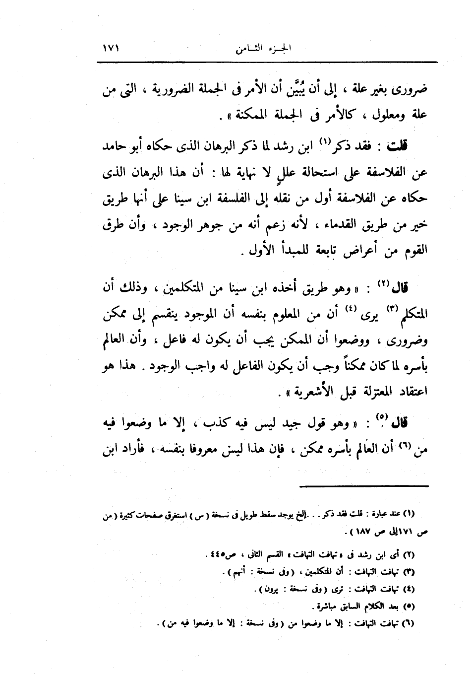 قلت: فقد ذكر ابن رشد لما ذكر البرهان الذي حكاه أبو حامد عن الفلاسفة على استحالة علل لا نهاية لها: أن هذا البرهان الذي حكاه عن الفلاسفة أول من نقله إلى الفلسفة ابن سينا على أنها طريق خير من طريق القدماء، لأنه زعم أنه من جوهر الوجود وأن طرق القوم من اعراض تابعة للمبدأ الأول.
