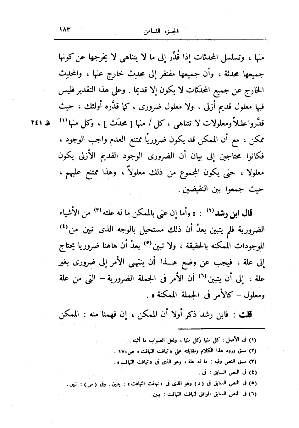 قال ابن رشد: (وأما إن عنى بالممكن ما له علته من الأشياء الضرورية فلم يتبين بعد أن ذلك مستحيل بالوجه الذي تبين من الموجودات الممكنة بالحقيقة، ولا تبين بعد أن ها هنا ضرورياً يحتاج إلى علة، فيجب عن وضع هذا أن ينتهي الأمر إلى ضروري بغير علة، إلى تبين أن الأمر في الجملة الضرورية - التي من علة معلول - كالأمر في الجملة الممكنة) .
