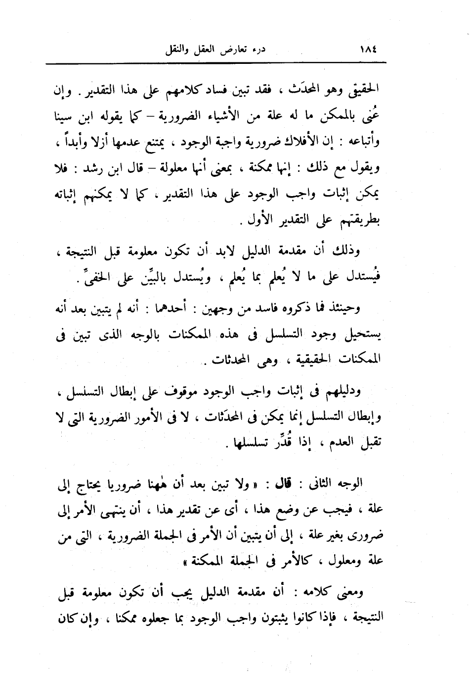 وإن عني بالممكن ما له علة من الأشياء الضرورية - كما يقوله ابن سينا وأتباعه: إن الأفلاك ضرورية واجبة الوجود، يمتنع عدمها أزلاً وأبداً، ويقول مع ذلك: إنها ممكنة، يمعنى أنها معلولة - قال ابن رشد: فلا يمكن إثبات واجب الوجود على هذا التقدير، كما لا يمكنهم إثباته بطريقتهم على التقدير الأول.