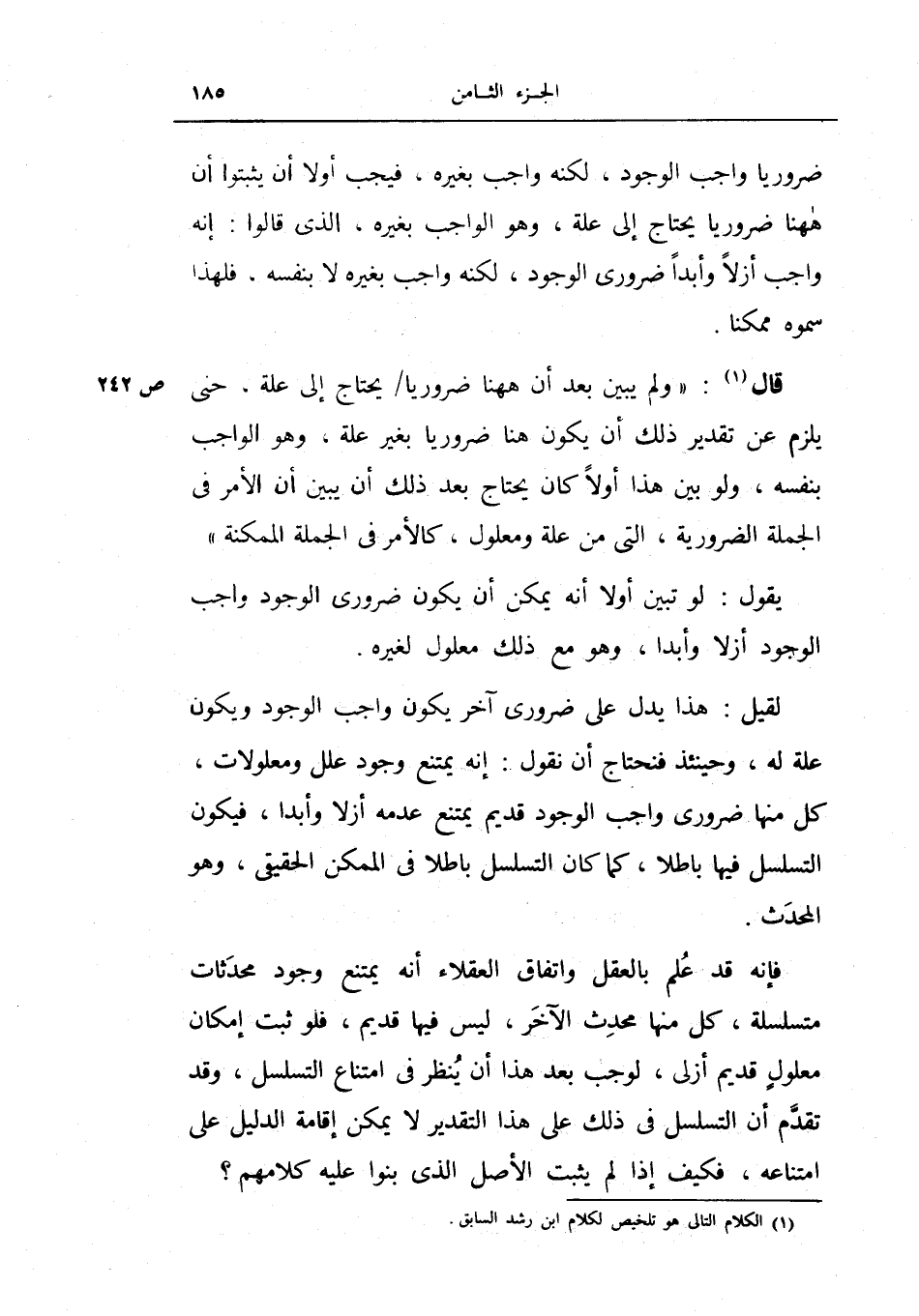 قال: (ولم يبين بعد أن ها هنا ضرورياً يحتاج إلى علة، حتى يلزم عن تقدير ذلك أن يكون هنا ضرورياً بغير علة، وهو الواجب بنفسه، ولو بين هذا أولاً كان يحتاج بعد ذلك أن يبين أن الأمر في الجملة الضرورية، التي من علة ومعلول، كالأمر في الجملة الممكنة) .