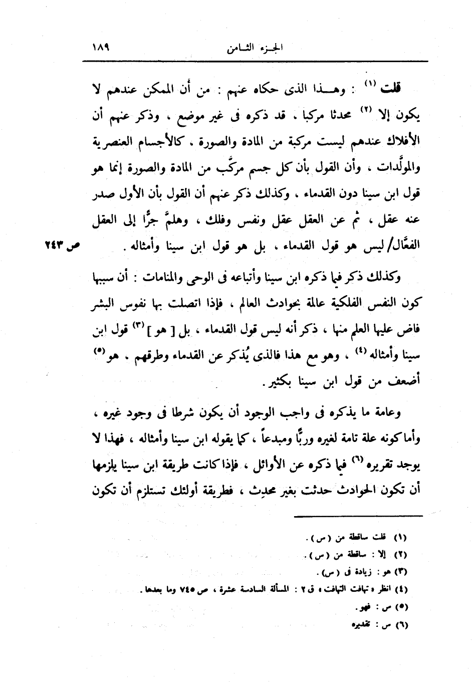 قلت: وهذا الذي حكاه عنهم: من أن الممكن عندهم لا يكون إلا محدثاً مركباً قد ذكره في غير موضع، وذكر عنهم أن الأفلاك عندهم ليست مركبة من المادة والصورة، كالأجسام العنصرية والمولدات، وأن القول بأن كل جسم مركب من المادة والصورة إنما هو قول ابن سينا دون القدماء، وكذلك ذكر عنهم أن القول بأن الأول صدر عنه عقل، ثم عن العقل عقل ونفس وفلك، وهلم جراً إلى العقل الفعال ليس هو قول القدماء، بل هو قول ابن سينا وأمثاله.