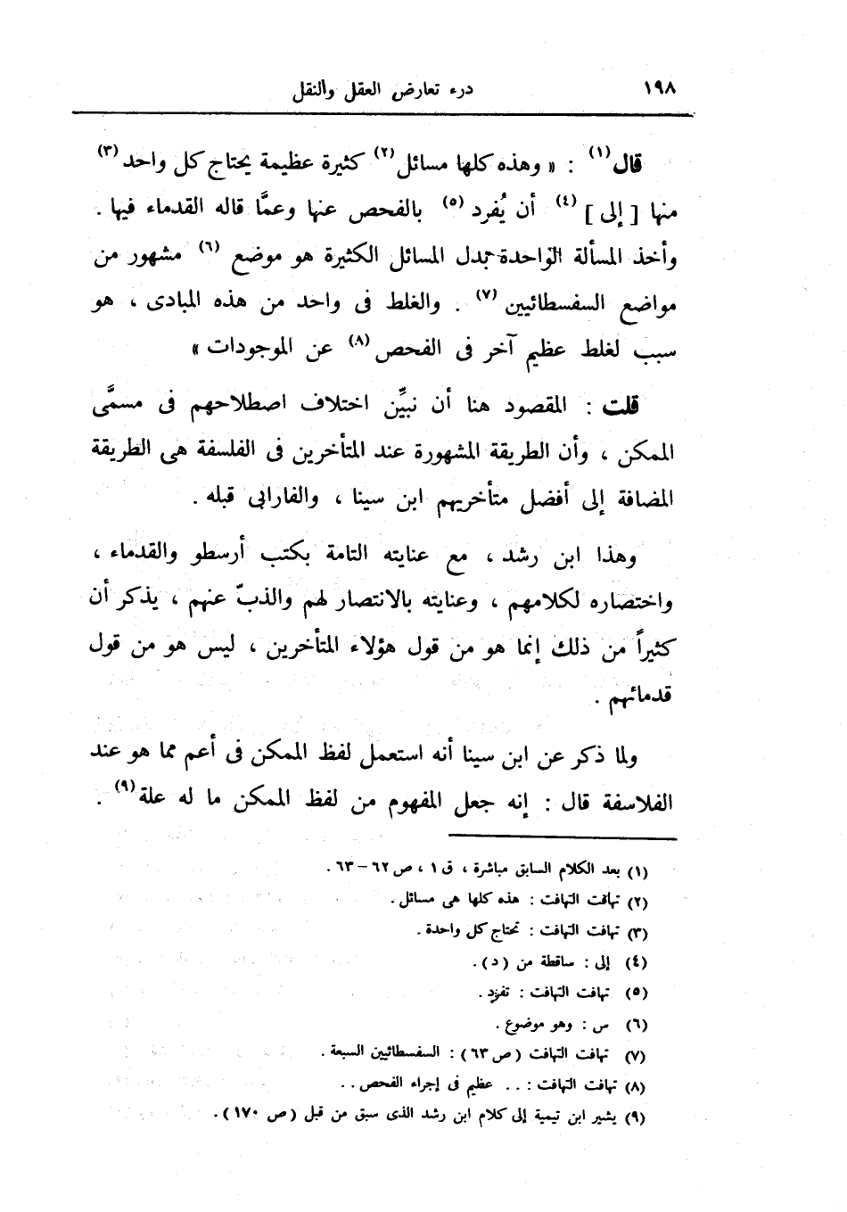 قلت: المقصود هنا أن بين اختلاف اصطلاحهم في مسمى الممكن، وأن الطريفة المشهورة عند المتأخرين في الفلسفة هي الطريفة المضافة إلى أفضل متأخريهم ابن سينا، والفارابي قبله.