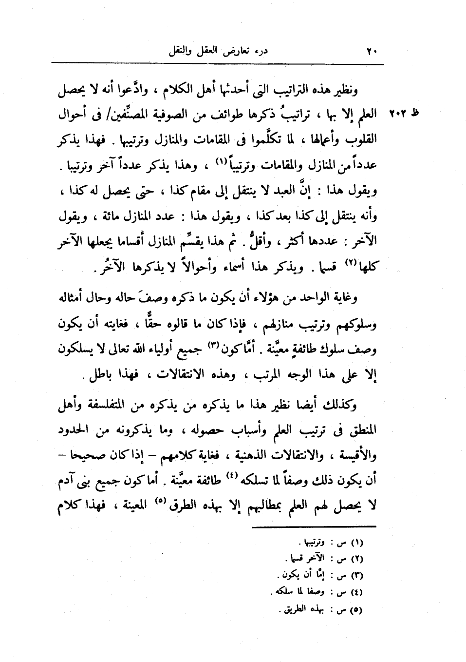 ونظير هذه التراتيب التي أحدثها أهل الكلام، وادعوا أنه لا يحصل العلم إلا بها، تراتيب ذكرها طوائف من الصوفية المصنفين في أحوال القلوب وأعمالها، لما تكلموا في المقامات والمنازل وترتيبها.