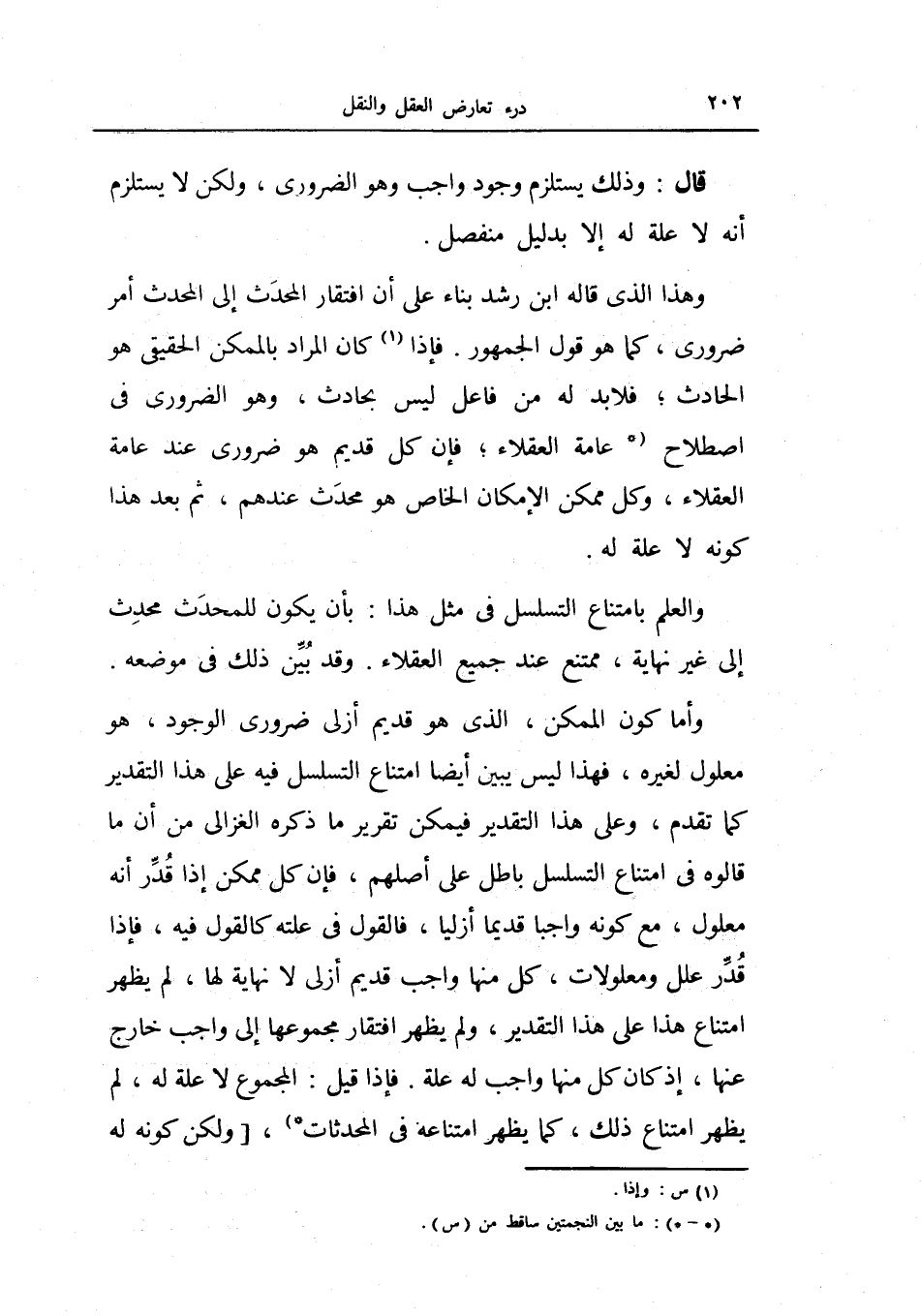 فإذا كان المراد بالممكن الحقيقي هو الحادث، فلا بد له من فاعل ليس بحادث، وهو الضروري في اصطلح عامة العقلاء، فإن كل قديم هو ضروري عند عامة العقلاء، وكل ممكن الإمكان الخاص هو محدث عندهم، ثم بعد هذا كونه لا علة له.