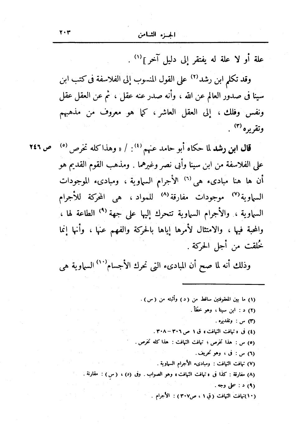 قال ابن رشد لما حكاه أبو حامد عنهم: (وهذا كله تخرص على الفلاسفة من ابن سينا وأبي نصر وغيرهما، ومذهب القوم القديم هو أنه ها هنا مبادىء هي الأجرام السماوية، ومبادىء الموجودات السماوية، موجودات مفارقة للمواد، هي المحركة للأجرام السماوية، والأجرام السماوية تتحرك إليها على جهة الطاعة لها، والمحبة فيها، والامتثال لأمرها إياها بالحركة والفهم عنها، وأنها إنما خلقت من أجل الحركة.