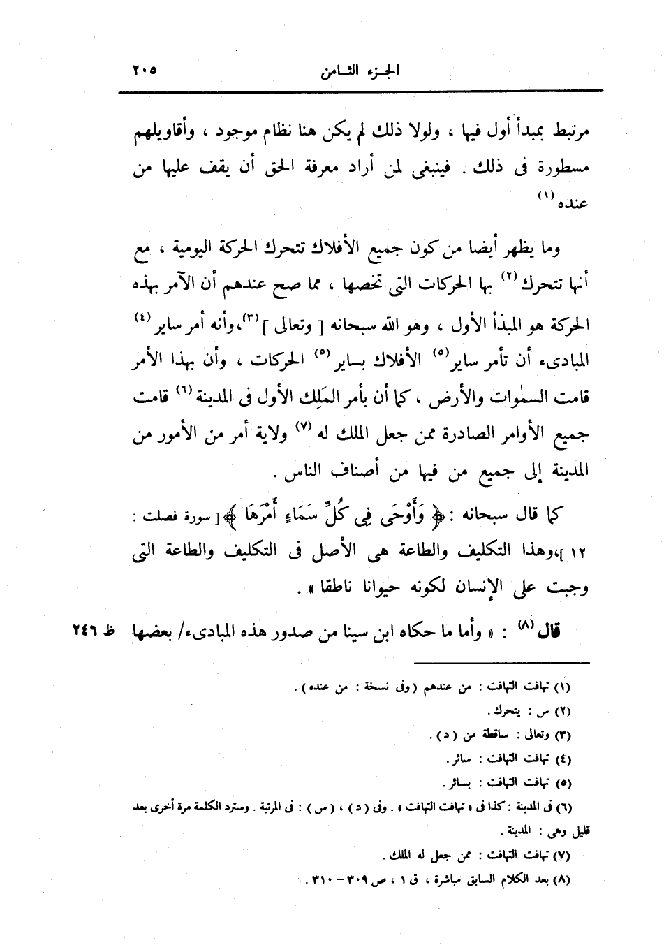 وما يظهر أيضاً من كون جميع الأفلاك تتحرك الحركة اليومية، مع أنها تتحرك بها الحركات التي تخصها، مما صح عندهم أن الآمر بهذه الحركة هو المبدأ الأول، وهو الله سبحانه وتعالى، وأنه أمر ساير المبادىء أن تأمر ساير الأفلاك بساير الحركات، وأن بهذا الأمر قامت السماوات والأرض، كما أن بأمر الملك الأول في المدينة قامت جميع الأوامر الصادرة ممن جعل الملك له ولاية أمر من الأمور من المدينة إلى جميع من فيها من أصناف الناس.