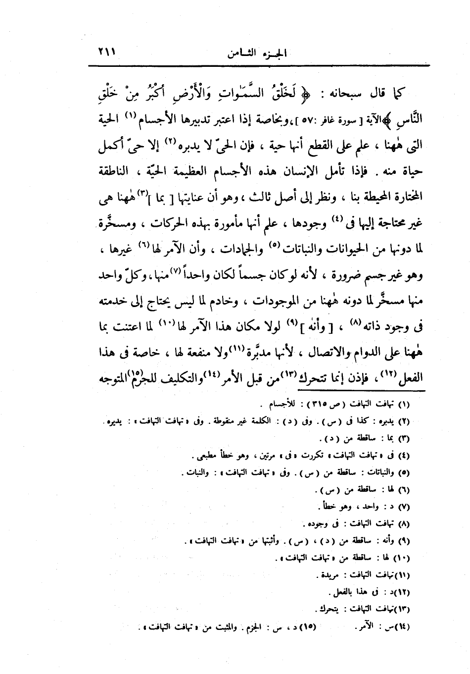 كما قال سبحانه: {لخلق السماوات والأرض أكبر من خلق الناس} الآية، وبخاصة إذا اعتبر تدبيرها الأجسام الحية التي ها هنا، علم على القطع أنها حية، فإن الحي لا يدبره إلى حي أكمل حياة منه، فإذا تأمل الإنسان هذه الأجسام العظيمة الحية، الناطقة المختارة المحيطة بنا، ونظر إلى أصل ثالث، وهو أن عنايتها بما ها هنا هي غير محتاجة إليها في وجودها، علم أنها مأمورة بهذه الحركات، ومسخرة لما دونها من الحيوانات والنباتات والجمادات، وأن الآمر لها غيرها، وهوغير جسم ضرورة، لأنه لو كان جسماً لكان واحداً منها، وكل واحد منها مسخر لما دونه ها هنا من الموجودات، وخادم لما ليس يحتاج إلى خدمته في وجود ذاته، وأنه لولا مكان هذا الآمر لها لما اعتنت بما ها هنا على الدوام والاتصال، لأنها مدبرة ولا منفعة لها، خاصة في هذا الفعل فإذن إنما تتحرك من قبل الأمر والتكليف للجرم المتوجه