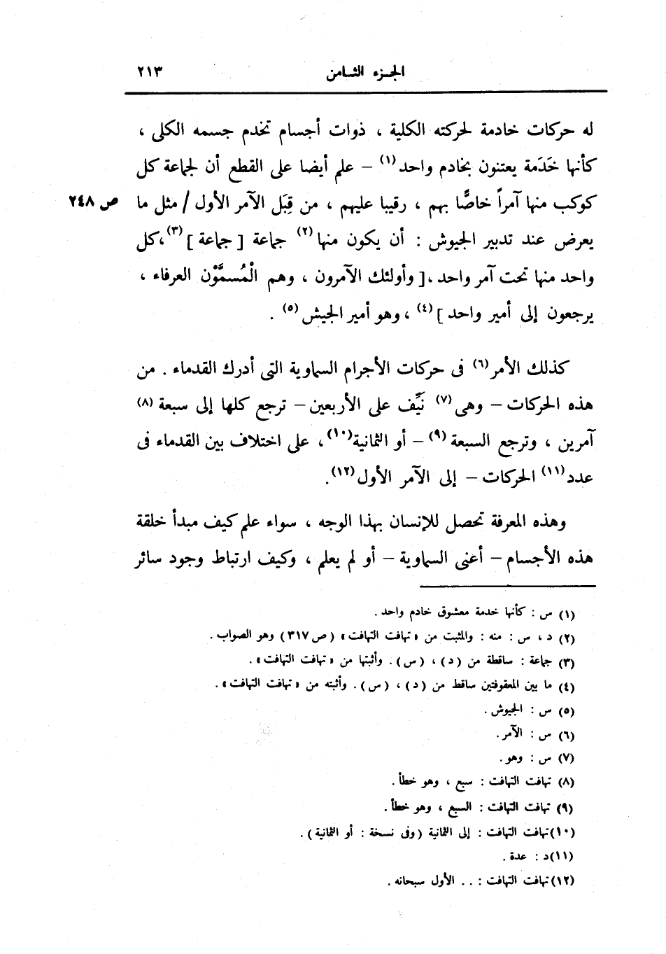 له حركات خادمة لحركاته الكلية، ذوات أجسام تخدم جسمه الكلي، كأنها خدمة يعتنون بخادم واحد - علم أيضاً على القطع أن لجماعة كل كوكب منها آمراً خاصاً بهم، رقيباً عليهم، من قبل الآمر الأول مثل ما يعرض عند تدبير الجيوش: أن يكون منها جماعة جماعة، كل واحد منها تحت آمر واحد، وأولئك الآمرون، وهم المسمون العرفاء، يرجعون إلى أمير واحد، وهو أمير الجيش.