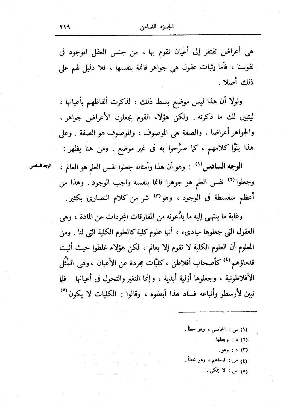 ولكن هؤلاء القوم يجعلون الأعراض جواهر، والجواهر أعراضاً، والصفة هي الموصوف، والموصوف هو الصفة.