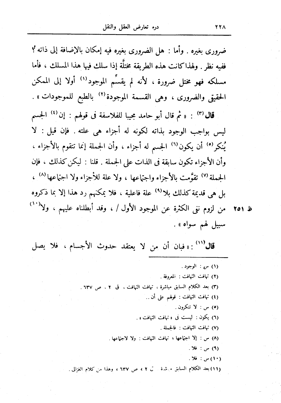 قال: (ثم قال أبو حامد مجيباً للفلاسفة في قولهم: إن الجسم ليس بواجب الوجود بذاته لكونه له أجزاء هي علته.