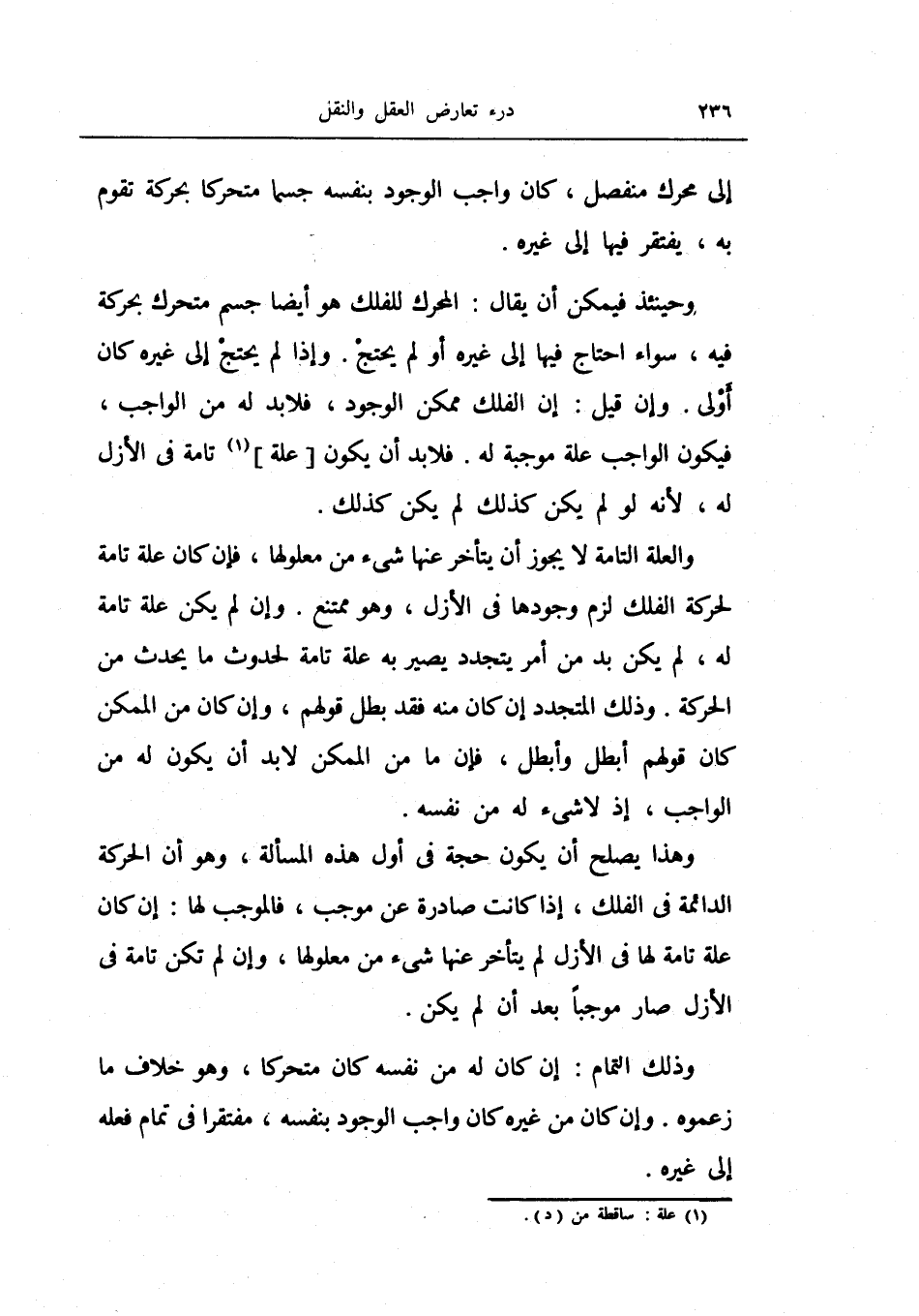 والعلة التامة لا يجوز أن يتأخر عنها شيء من معلولها، فإن كان علة تامة لحركة الفلك لزم وجودها في الأزل، وهو ممتنع.