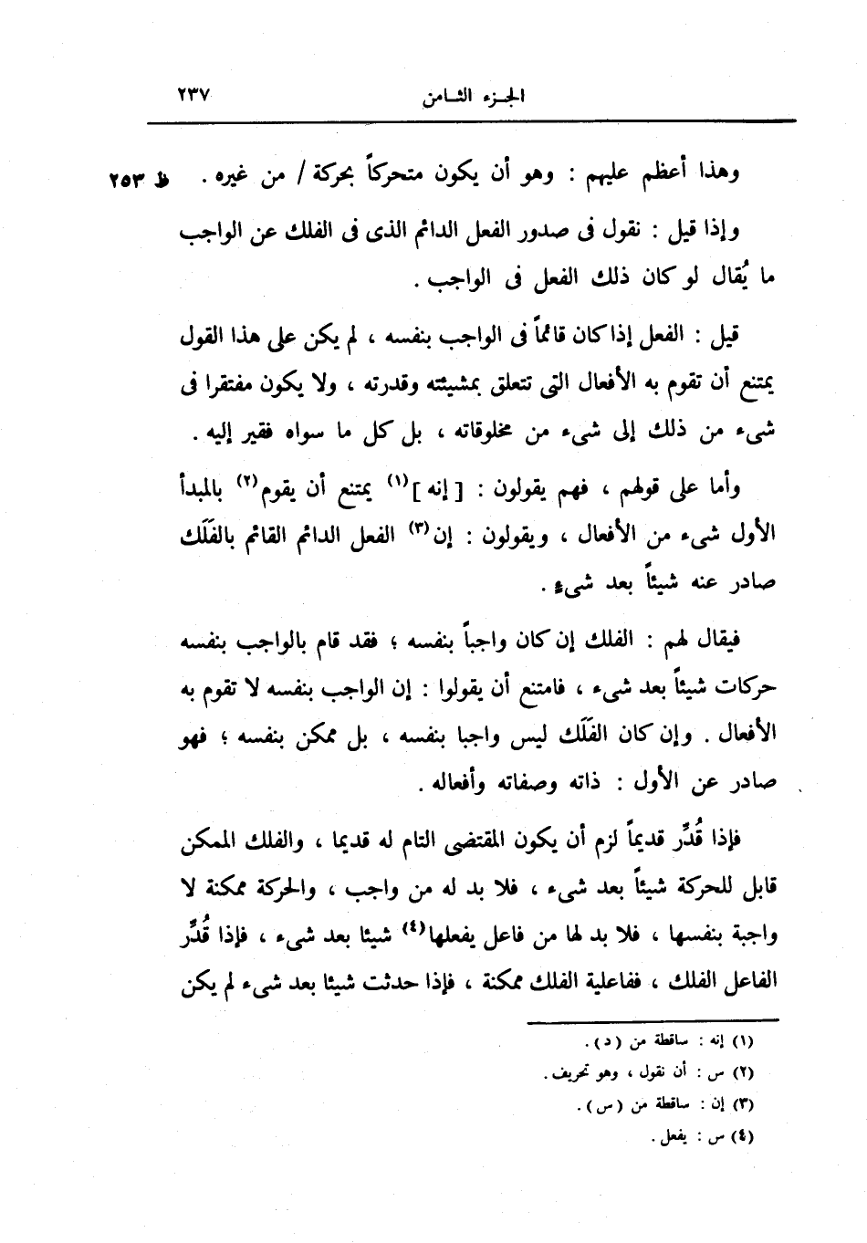 فيقال لهم: الفلك إن كان واجباً بنفسه، فقد قام بالواجب بنفسه حركات شيئاً بعد شيء، فامتنع أن يقولوا: إن الواجب بنفسه لا تقوم به الأفعال.