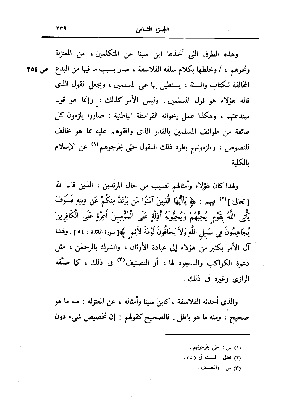 ولهذا كان لهؤلاء وأمثالهم نصيب من حال المرتدين، الذين قال الله تعال فيهم: {يا أيها الذين آمنوا من يرتد منكم عن دينه فسوف يأتي الله بقوم يحبهم ويحبونه أذلة على المؤمنين أعزة على الكافرين يجاهدون في سبيل الله ولا يخافون لومة لائم} ولهذا آل الأمر بكثير من هؤلاء إلى عبادة الأوثان، والشرك بالرحمن مثل دعوة الكواكب والسجود لها، أو التصنيف في ذلك كما صنفه الرازي وغيره في ذلك.