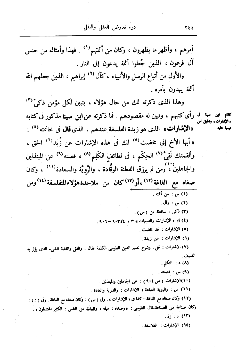 فما ذكرته عن ابن سينا مذكور في كتابه الإشارات الذي هو زبدة الفلسفة عندهم، الذي قال في خاتمته: (أيها الأخ إن مخضت لك في هذه الإشارات عن زبد الحق، وألقمتك نفي الحكم، في لطائف الكلم، فصنه عن المبتذلين والجاهلين، ومن لم يرزق الفطنة الوقادة، والروية والسعادة، وكان صغاه مع الغاغة، أو كان من ملاحدة هؤلاء المتفلسفة ومن