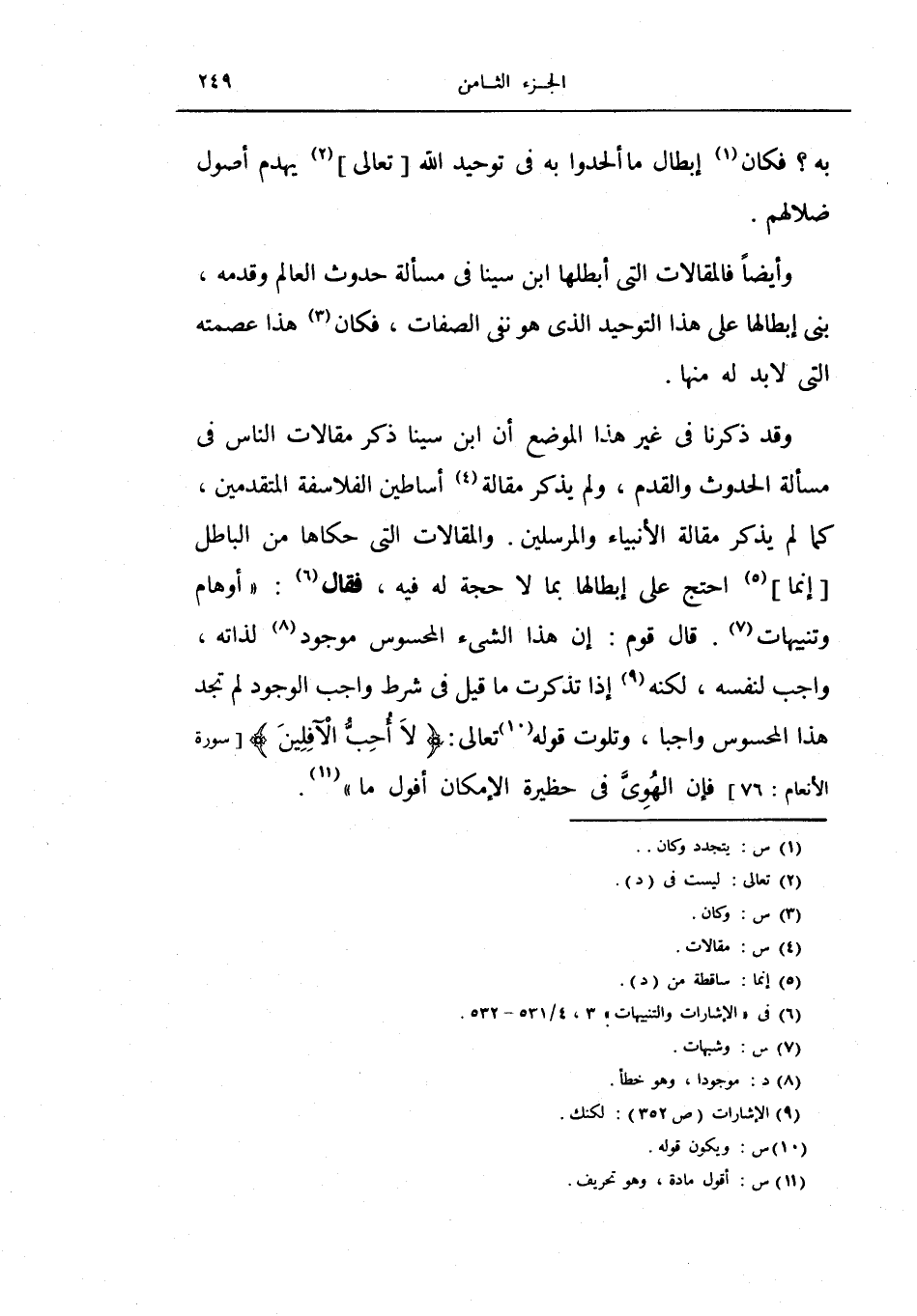 قال قوم: إن هذا الشيء المحسوس موجود لذاته، واجب لنفسه، لكنه إذا تذكرت ما قيل في شرط واجب الوجود لم تجد هذا المحسوس واجباً، وتلوت قوله تعالى: {لا أحب الأفلين} فإن الهوي في حظيرة الإمكان أفول ما) .