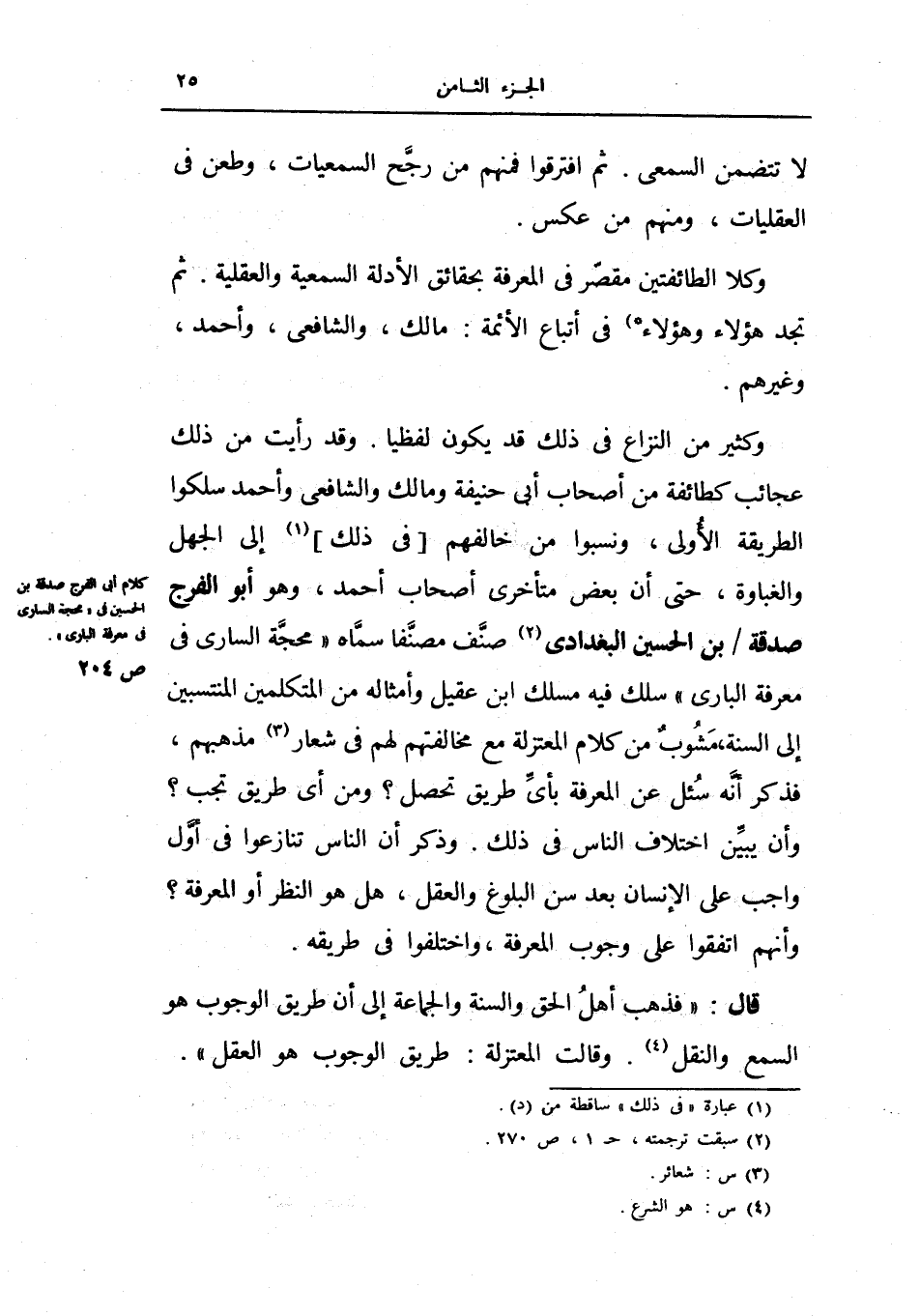 وقد رأيت من ذلك عجائب كطائفة من أصحاب أبي حنيفة ومالك والشافعي وأحمد سلكوا الطريقة الأولى، ونسبوا من خالفهم في ذلك إلى الجهل والغباوة، حتى أن بعض متأخري أصحاب أحمد، وهو أبو الفرج صدقة ابن الحسين البغدادي صنف مصنفاً سماه محجة الساري في معرفة الباري سلك فيه مسلك ابن عقيل وأمثاله من المتكلمين المنتسبين إلى السنة، مشوب من كلام المعتزلة مع مخالفتهم لهم في شعار مذهبهم، فذكر أنه سئل عن المعرفة بأي طريق تحصل؟ ومن أي طريق تجب؟ وأن يبين اختلاف الناس في ذلك.