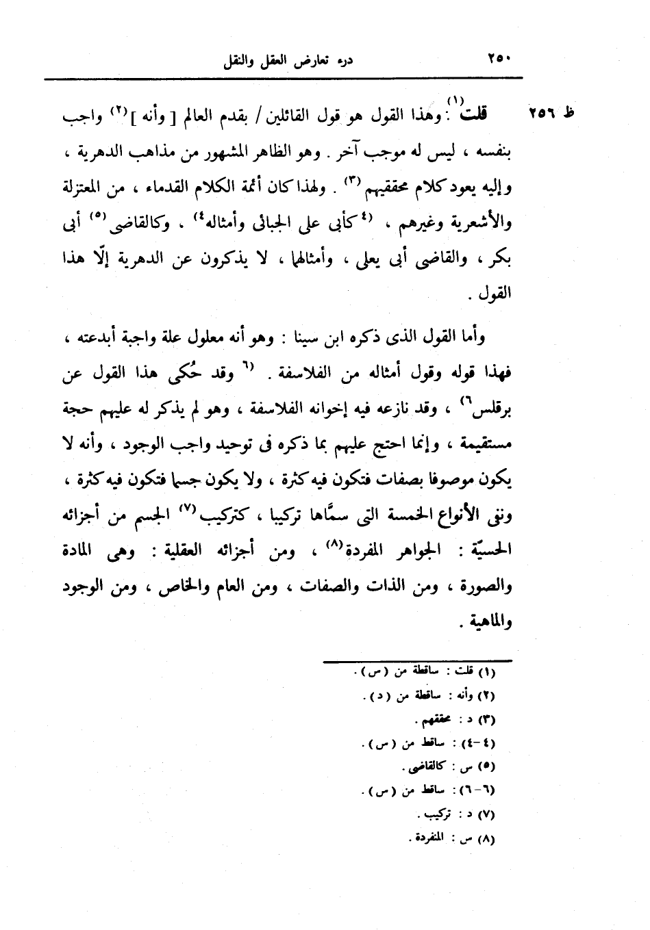 وقد حكي هذا القول عن برقلس، وقد نازعه فيه إخوانه الفلاسفة، وهو لم يذكر له عليهم حجة مستقيمة، وإنما احتج عليهم بما احتج عليهم بما ذكره في توحيد واجب الوجود، وأنه لايكون موصوفاً بصفات فتكون فيه كثرة، ولا يكون جسماً فتكون فيه كثرة، ونفى الأنواع الخمسة التي سماها تركيباً كتركيب الجسم من أجزائه الحسية: الجواهر المفردة، ومن أجزائه العقلية: وهي المادة والصورة، ومن الذات والصفات، ومن العام والخاص، ومن الوجود والماهية.