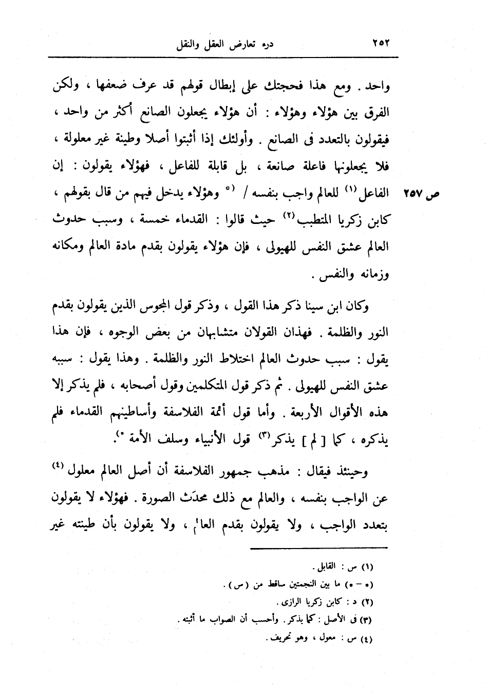 وأولئك إذا أثبتوا أصلاً وطنية غير معلولة، فلا يجعلونها فاعلة صانعة، بل قابلة للفاعل، فهؤلاء يقولون: إن الفاعل للعالم واجب بنفسه وهؤلاء يدخل فيهم من قال بقولهم، كابن زكريا المتطبب حيث قالوا: القدماء خمسة، وسبب حدوث العالم عشق النفس للهيولى، فإن هؤلاء يقولون بقدم مادة العالم ومكانه وزمانه والنفس.