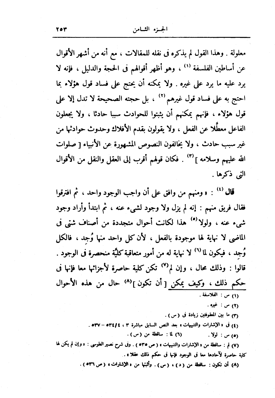 قال: (ومنهم من وافق على أن واجب الوجود واحد، ثم افترقوا فقال فريق منهم: إنه لم يزل ولا وجود لشيء عنه، ثم ابتدأ وأراد وجود شيء عنه، ولولا هذا لكانت أحوال متجددة من أصناف شتى في الماضي لا نهاية لها موجودة بالفعل، لأن كل واحد منها وجد، فالكل وجد، فيكون لما لا نهاية له من أمور متعاقبة كلية منحصرة في الوجود.
