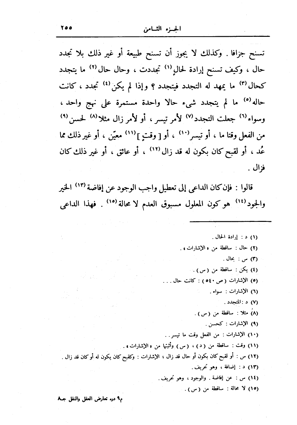 وكذلك لا يجوز أن تسنح طبيعة أو غير ذلك بلا تجدد حال، وكيف تسنح إرادة لحال تجددت، وحال حال ما يتجدد كحال ما يمهد له التجدد فيتجدد؟ وإذا لم يكن تجدد، كانت حاله ما لم يتجدد شيء حالاً واحدة مستمرة على نهج واحد، وسواء جعلت التجدد لأمر تيسر، أو لأمر زال مثلاً لحسن من الفعل وقتاً ما، أو تيسر، أو وقت معين، أوغير ذلك مما عد، أو لقبح كان يكون له قد زال، أو عائق، أوغير ذلك كان فزال.