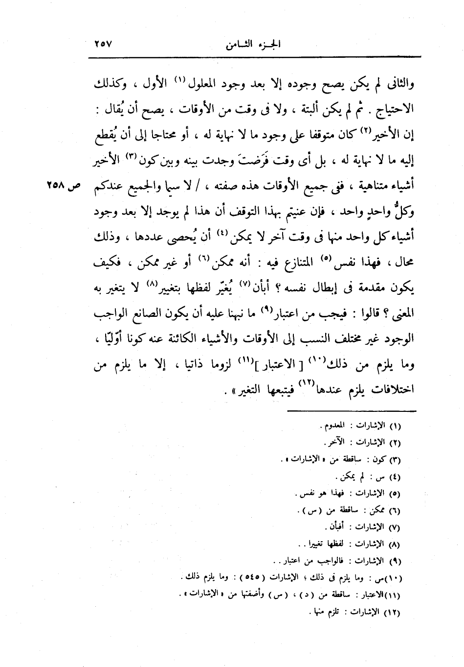 ثم لم يكن البتة ولا في وقت من الأوقات، يصح أن يقال: إن الأخير كان متوقفاً على وجود مالا نهاية، أو محتاجاً إلى أن يقطع إليه ما لا نهاية له، بل أي وقت فرضت وجدت بينه وبين كون الأخير أشياء متناهية، ففي جميع الأوقات هذه صفته، لا سيما والجميع عندكم وكل واحد واحد، فإن عنيتم بهذا التوقف أن هذا لم يوجد إلا بعد وجود أشياء كل واحد منها في وقت آخر لا يمكن أن يحصى عددها، وذلك محال، فهذا نفس المتنازع فيه: أنه ممكن أوغير ممكن، فكيف يكون مقدمة في إبطال نفسه؟ أبان يغير لفظها بتغيير لا يتغيره به المعنى؟ قالوا: فيجب من اعتبار ما نبهنا عليه أن يكن الصانع الواجب الوجود غير مختلف النسب إلى الأوقات والأشياء الكائنة عنه كوناً أولياً وما يلزم من ذلك الاعتبار لزوماً ذاتياً، إلا ما يلزم من الاختلافات يلزم عندها فيتبعها التغير) .