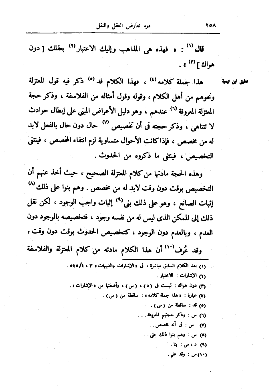 هذا جملة كلامه، فهذا الكلام قد ذكر فيه قول المعتزلة ونحوهم من أهل الكلام، وقوله وقول أمثاله من الفلاسفة، وذكر حجة المعتزلة المعروفة عندهم، وهو دليل الأعراض المبني على إبطال حوادث لا تتناهى، وذكر حجته في أن تخصيص حال دون حال بالفعل لا بد له من مخصص، فإذا كانت الأحوال متساوية لزم انتفاء المخصص، فينتفي التخصيص، فينتفي ما ذكروه من الحدوث.
