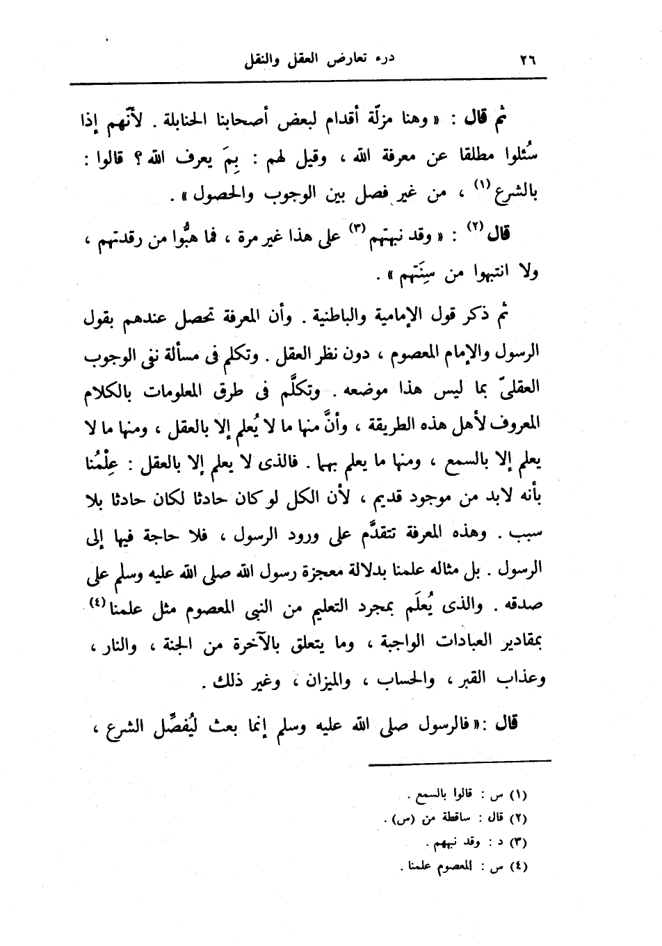 ثم ذكر قول الإمامية والباطنية، وأن المعرفة تحصل عندهم بقول الرسول والإمام المعصوم، دون نظر العقل.