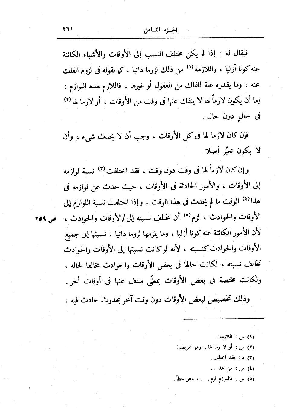 وإن كان لازماً لها في وقت دون وقت، فقد اختلف نسبة لوازمه إلى الأوقات، والأمور الحادثة في الأوقات، حيث حدث عن لوازمه في هذا الوقت ما لم يحدث في هذا الوقت، وإذا اختلفت نسبة اللوازم إلى الأوقات والحودث، لزم أن تختلف نسبته إلى الأوقات والحوادث، لأن الأمور الكائنة عنه كوناً أزلياً، وما يلزمها لزوماً ذاتياً، نسبتها إلى جميع الأوقات والحوادث كنسبته، لأنه لو كانت نسبتها إلى الأوقات والحوادث تخالف نسبته، لكانت حالها في بعض الأوقات والحوادث مخالفاً لحاله، ولكانت مختصة في بعض الأوقات بمعنى منتف في أوقات أخر.