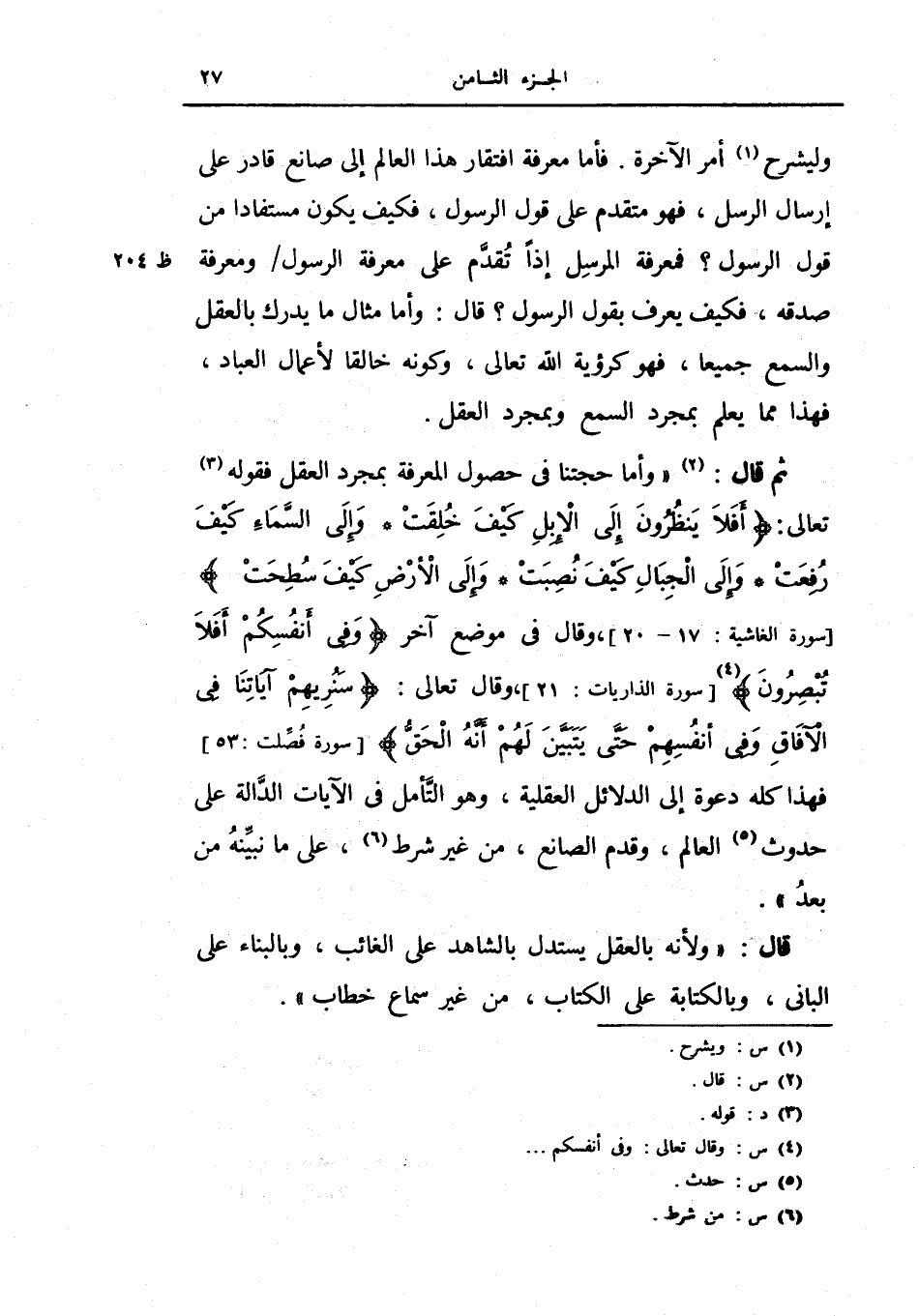 ثم قال: (وأما حجتنا في حصول المعرفة بمجرد العقل فقوله تعالى: {أفلا ينظرون إلى الإبل كيف خلقت * وإلى السماء كيف رفعت * وإلى الجبال كيف نصبت * وإلى الأرض كيف سطحت} ، وقال في موضع آخر {وفي أنفسكم أفلا تبصرون} ، وقال تعالى: {سنريهم آياتنا في الآفاق وفي أنفسهم حتى يتبين لهم أنه الحق} ، فهذا كله دعوة إلى الدلائل العقلية، وهو التأمل في الآيات الدالة على حدوث العالم، وقدم الصانع، من غير شرط، على ما نبنيه من بعد) .