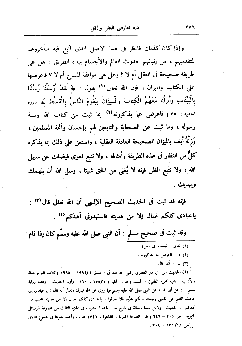 وهل هي موافقة للشرع أم لا؟ فعرضها على الكتاب والميزان، فإن الله تعالى يقول: {لقد أرسلنا رسلنا بالبينات وأنزلنا معهم الكتاب والميزان ليقوم الناس بالقسط} ، فاعرض عما يذكرونه بما ثبت من كتاب الله وسنة رسوله، وما ثبت عن الصحابة التابعين لهم بإحسان وأئمة المسلمين، وزنه أيضاً بالميزان الصحيحة العادلة العقلية، واستعن على ذلك بما يذكره كل من النظار في هذه الطريقة وأمثالها، ولا تتبع الهوى فيضلك عن سبيل الله، ولا تتبع الظن فإنه لا يغنى من الحق شيئاً، وسل الله أن يلهمك ويهديك.