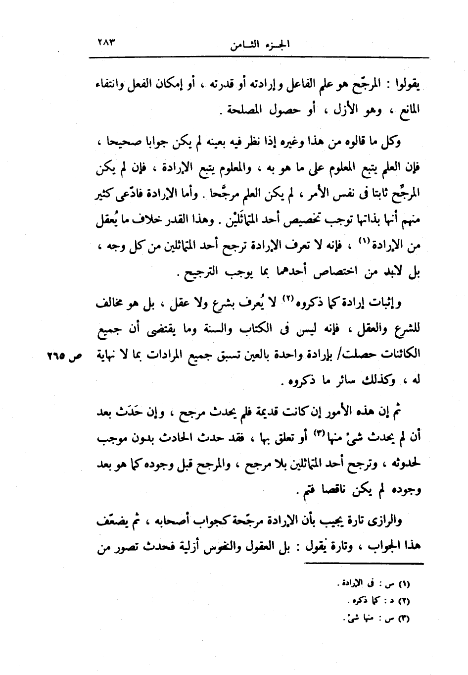 ثم إن هذه الأمور إن كانت قديمة فلم يحدث مرجح، وإن حدث بعد أن لم يحدث شيء منها أو تعلق بها، فقد حدث الحادث بدون موجب لحدوثه، وترجح أحد المتماثلين بلا مرجح، فقد حدث الحادث بدون موجب لحدوثه، والمرجح قبل وجوده كما هو بعد وجوده لم يكن ناقصاً فتم.