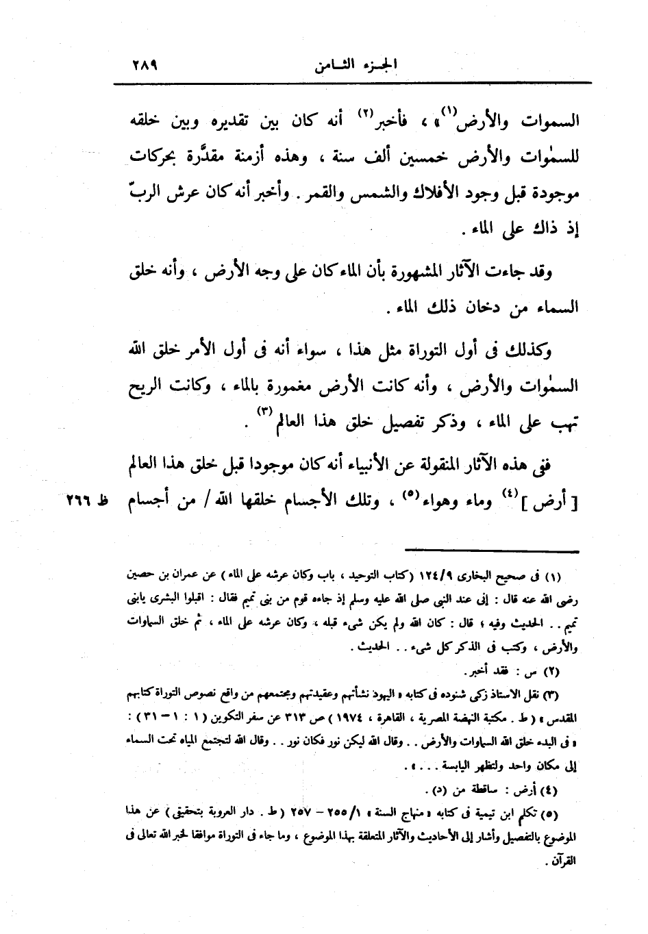 وقد جاءت الآثار المشهورة بأن الماء كان على وجه الأرض، وأنه خلق السماء من دخان ذلك الماء.