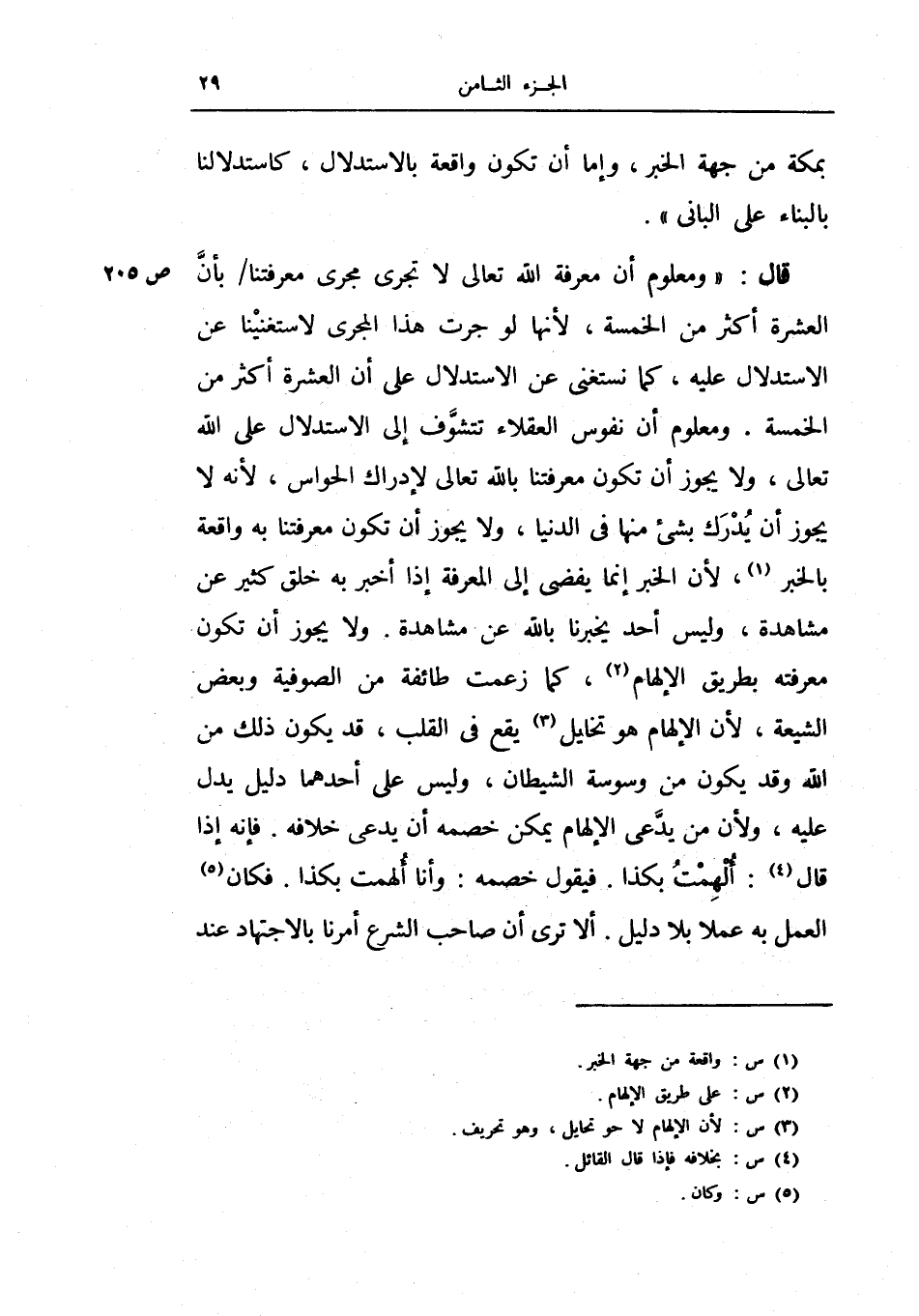 ولا يجوز أن تكون معرفته بطريق الإلهام، كما زعمت طائفة من الصوفية وبعض الشيعة، لأن الإلهام هو تخايل يقع في القلب، قد يكون ذلك من الله وقد يكون من وسوسة الشيطان، وليس على أحدهما دليل يدل عليه، ولأن من يدعي الإلهام يمكن خصمه أن يدعي خلافه.