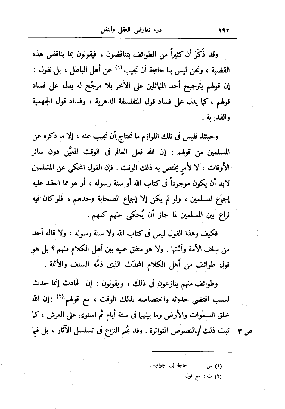 وطوائف منهم ينازعون في ذلك، ويقولون: إن الحادث إنما حدث لسبب اقتضى حدوثه واختصاصه بذلك الوقت، مع قولهم: إن الله خلق السماوات والأرض وما بينهما في ستة أيام ثم استوى على العرش، كما ثبت ذلك بالنصوص المتواترة، وقد علم النزاع في تسلسل الآثار، بل فيما