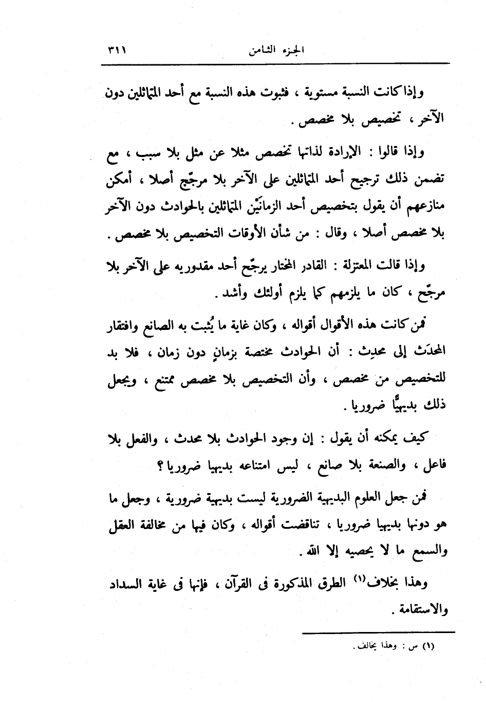 وإذا قالوا: الإرادة لذاتها تخصص مثلاً عن مثل بلا سبب، مع تضمن ذلك ترجيح أحد المتماثلين على الآخر بلا مرجح أصلاً، أمكن منازعهم أن يقول بتخصيص أحد الزمانين المتماثلين بالحوادث دون الآخر بلا مخصص أصلاً، وقال: من شأن الأوقات التخيصص بلا مخصص.