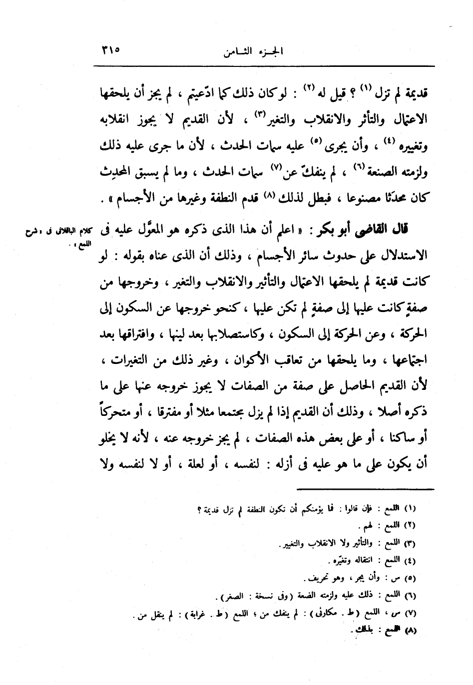 قال القاضي أبو بكر: (اعلم أن هذا الذي ذكره هو المعول عليه في الاستدلال على حدوث سائر الأجسام، وذلك أن الذي عناه بقوله: لو كانت قديمة لم يلحقها الاعتمال والتأثير والانقلاب والتغير، وخروجها من صفة كانت عليها إلى صفة لم تكن عليها، كنحو خروجها عن السكون إلى الحركة، وعن الحركة إلى السكون، وكاستصلابها بعد لينها، وافتراقها بعد اجتماعها، وما يلحقها من تعاقب الأكوان، وغير ذلك من التغيرات، لأن القديم الحاصل على صفة من الصفات لا يجوز خروجه عنها على ماذكره أصلاً، وذلك أن القديم إذا لم يزل مجتمعاً مثلاً أو مفتقراً، أومتحركاً أو ساكناً، أو على بعض هذه الصفات، لم يجز خروجه عنه، لأنه لايخلو أن يكون على ما هو عليه في أزله: لنفسه، أو لعلة، أولا لنفسه ولا