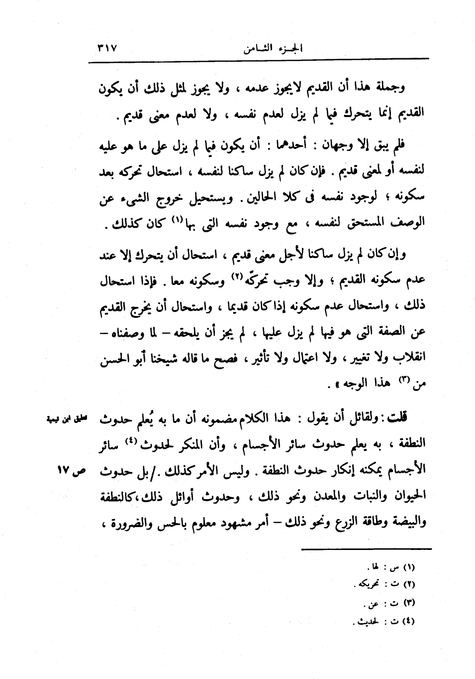 فإذا استحال ذلك، واستحال عدم سكونه إذا كان قديماً، واستحال أن يخرج القديم عن الصفة التي هو فيها لم يزل عليها، لم يجز أن يلحقه - لما وصفناه - وانقلاب ولا تغيير، ولا اعتمال ولا تأثير، فصح ما قاله شيخنا أبو الحسن من هذا الوجه) .