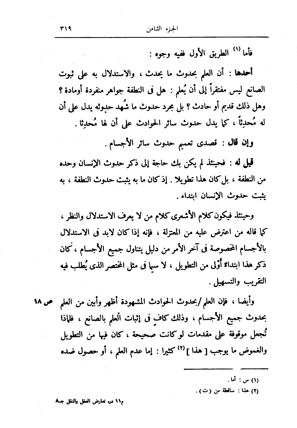 وأيضاً، فإن العلم بحدوث الحوادث المشهودة أظهر وأبين من العلم بحدوث جميع الأجسام، وذلك كاف في إثبات العلم بالصانع، فلماذا تجعل موقوفة على مقدمات لو كانت صحيحة، كان فيها من التطويل والغموض ما يوجب هذا كثيراً: إما عدم العلم، أو حصول ضده