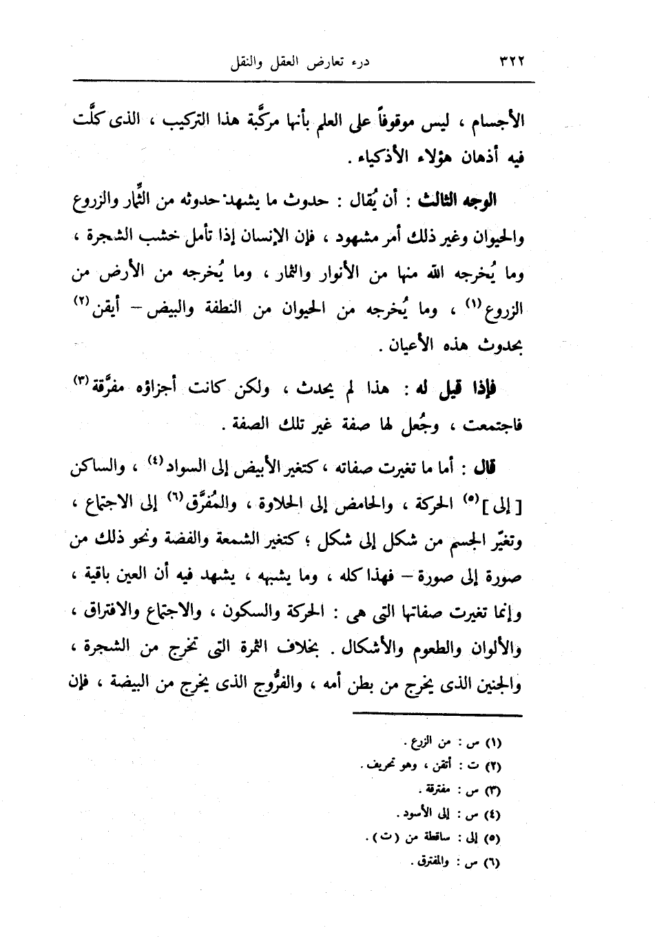 الوجه الثالث: أن يقال: حدوث مايشهد حدوثه من الثمار والزروع والحيوان وغير ذلك أمر مشهود، فإن الإنسان إذا تأمل خشب الشجرة، وما يخرجه الله منها من الأنوار والثمار، وما يخرجه من الأرض من الزروع، وما يخرجه من الحيوان من النطفة والبيض - أيقن بحدوث هذه الأعيان.