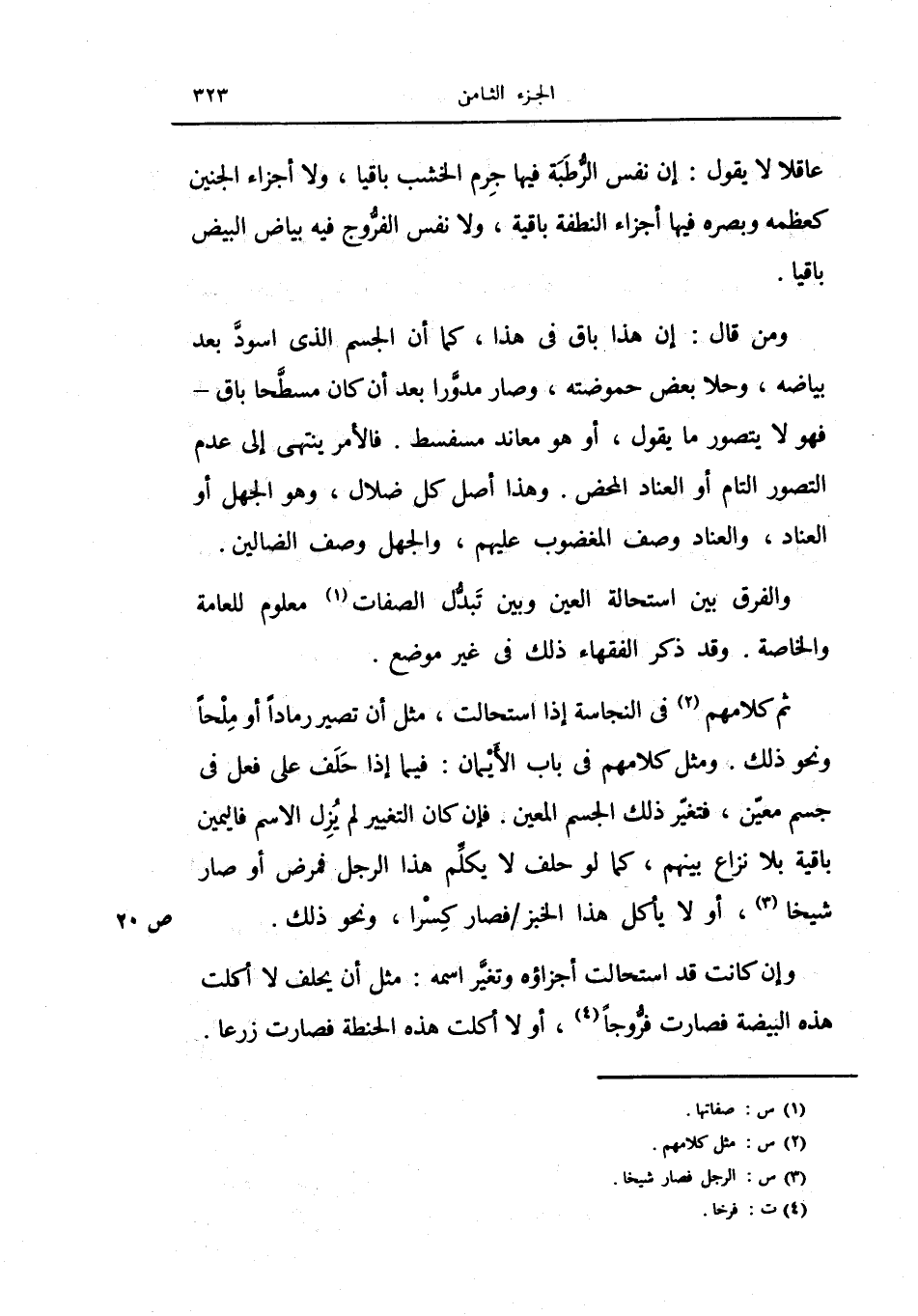 عاقلاً لا يقول: إن نفس الرطبة فها جرم الخشب باقياً، ولا أجزاء الجنين كعظمه وبصره فيه أجزاء النطفة باقية، ولا نفس الفروج فيه بياض البيض باقياً.