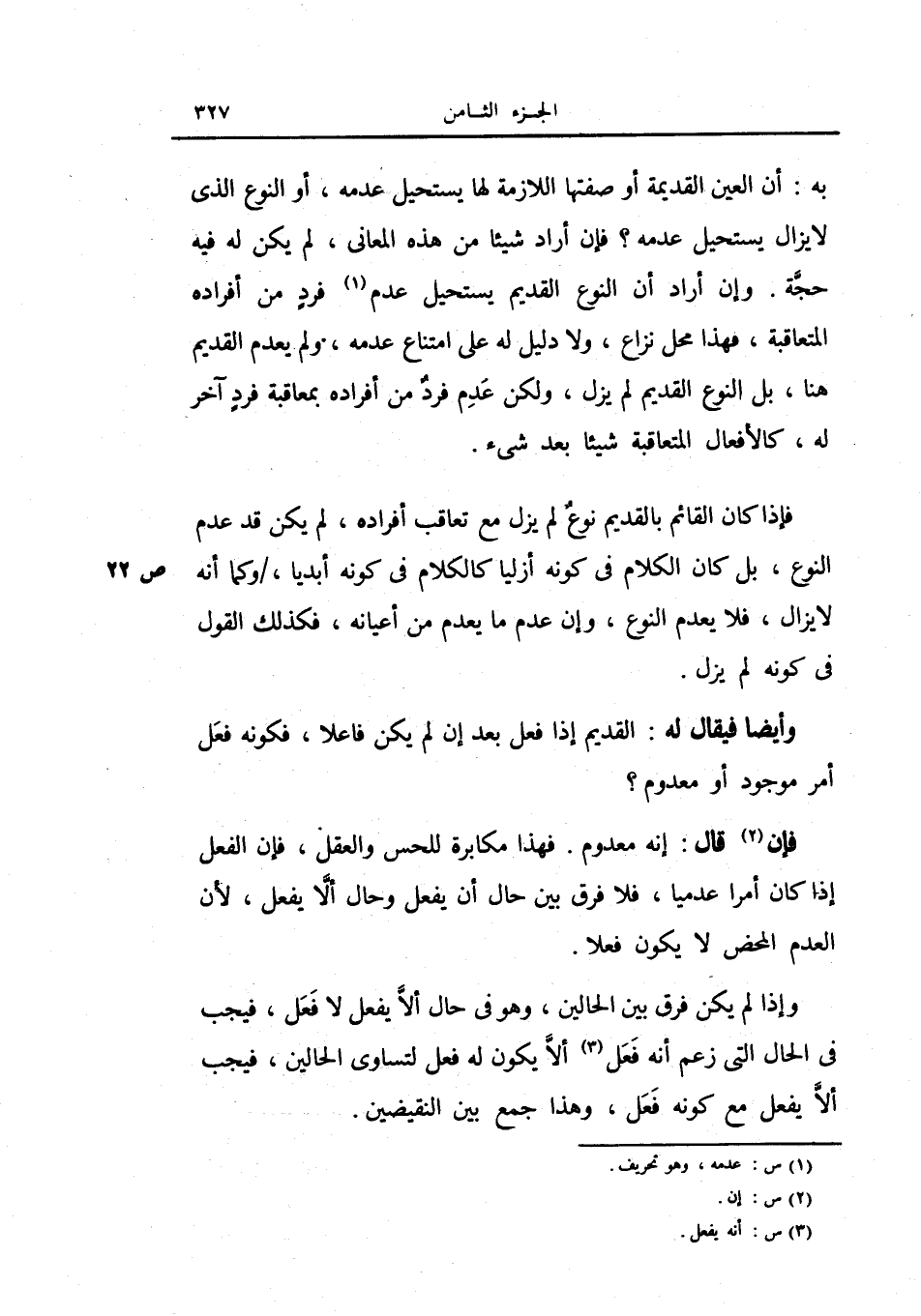 به: أن العين القديمة أو صفتها اللازمة لها يستحيل عدمه، أو النوع الذي لا يزال يستحيل عدمه؟ فإن أراد شيئاً من هذه المعاني، لم يكن له فيه حجة.