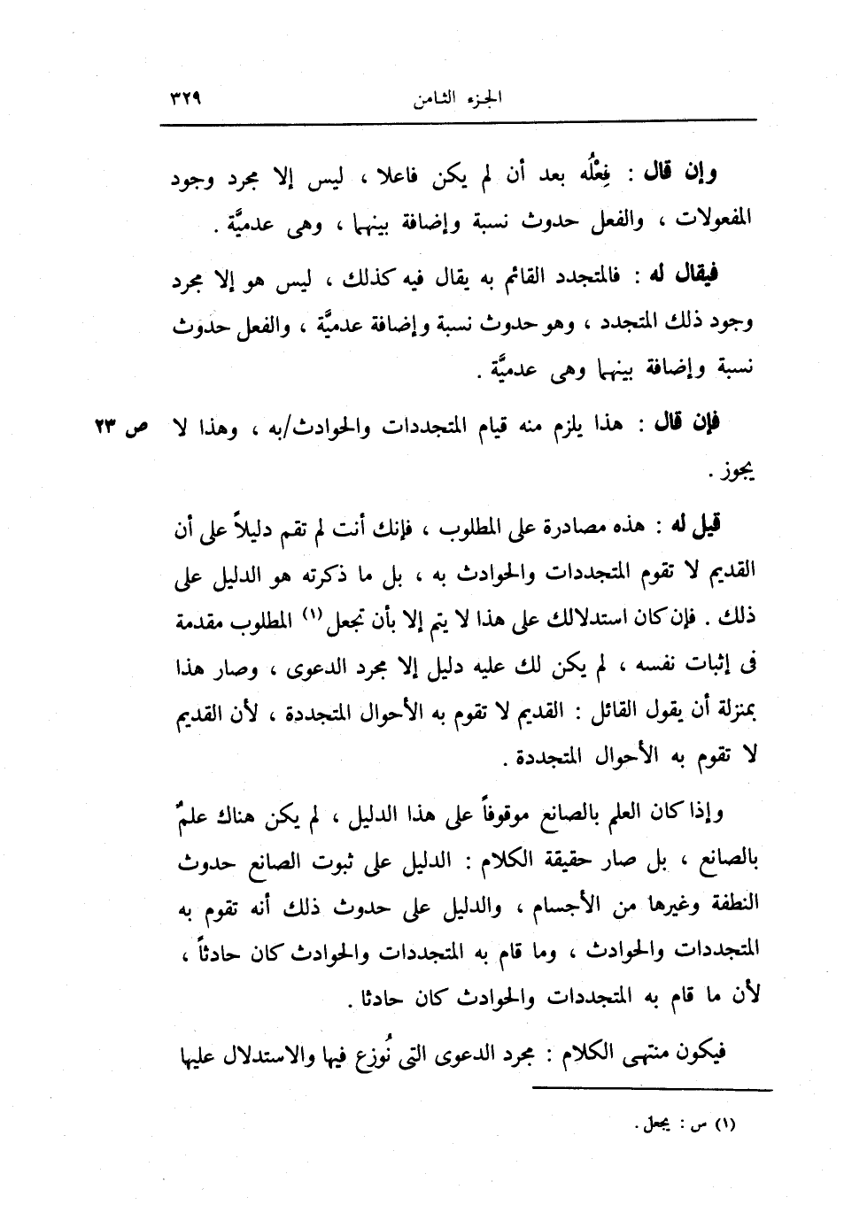 فيقال له: فالمتجدد القائم به يقال فيه كذلك، ليس هو إلا مجرد وجود ذلك المتجدد، وهو حدوث نسبة وإضافة عدمية، والفعل حدوث نسبة وإضافة نسبة وإضافة بيهما وهي عدمية.